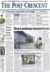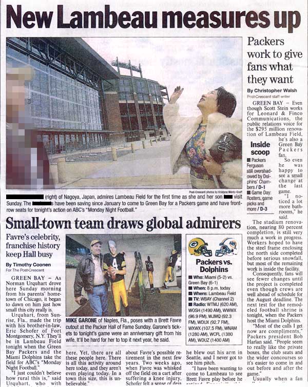 また、ランボー・フィールドに戻り、プロショップでジャンパー、腕時計,掛け時計、ペンダント、旗etcを買い求め、いい気分で写真をとっていたら、現地の記者の取材を受けた。片言で応対したらこれが、11月4日アップルトンのThe
