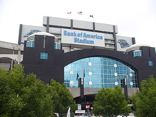 kobaさんと連絡を取り、することもないのでちょっと早いけどスタジアム行きましょうということになり、10時前にホテルを出ました(試合開始は午後1時です)。シャーロットは暑いだろうと思っていたのでパッカーズのTシャツに短パン、それにパッカーズのキャップをかぶって出ましたが、意外に寒いのです(ウェアの類はグリーンベイに行ってから買うつもりで、初めからあまり持ってきていません)。そのうち暖かくなるだろうとそのまま歩いていると数分でスタジアムに着きました。