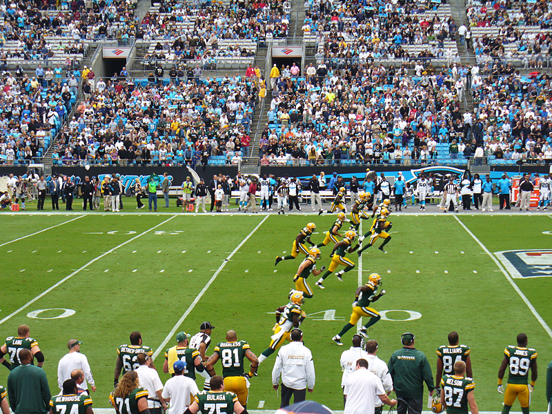国歌斉唱とお決まりのジェット戦闘機の飛来の後、午後1時、メイソン・クロスビーのキックオフで試合が始まりました。パンサーズの第1シリーズ、QBはドラフト全体1位で指名した新人のキャム・ニュートンです。前年度32チーム中最下位だったパンサーズは、オーバーン大を全米1位に導きハイズマントロフィーを獲得したニュートンを指名したのです。メンバー表を見るとベアーズにいたTEのグレッグ・オルセンや、ジャイアンツ、セインツで活躍した同じくTEのジェレミー・ショッキーまでいるではないか。