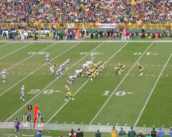 全員で"This is our house !!!"と大合唱し、興奮が高まってくる。そう、俺たちはお客さんじゃない。ここは俺たちの家だ。矢でも鉄砲でも持って来い。この高揚感がたまらない。ライオンズ側から選手入場が始まった。WRシュレーダーには特別大きなブーイングをお見舞いする。そしてパッカーズの選手たち。ババ・フランクスにテリー・グレン、アーマン・グリーン。そしてブレット・ファーヴが、少し背中を屈めて走ってくる。ああ、本物のブレット・ファーヴだ。体中が痺れたようになり、逆に声が出なくなってしまった。アメリカ国歌は、5人のグループによるアカペラ。終わるところで4機編隊によるFly Overがカッコよく決まった。