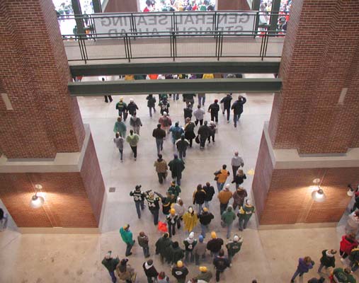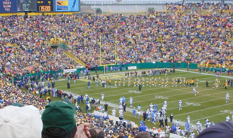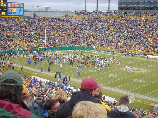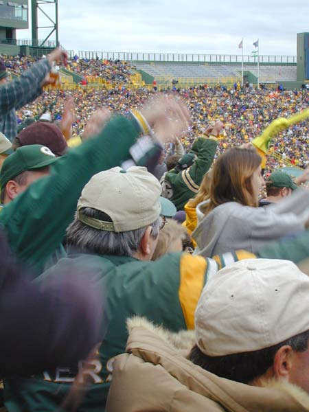 もうスタンドはリラックスムードで、他球場の途中経過に一喜一憂する余裕が出来ている。第3Qが終わるとパッカーズはQBファーヴを下げてしまい、完全な楽勝モード。サイドラインのファーヴに「MVP!MVP!」の大合唱が起こる。これまでも、ウェーブを起こそうと何度もトライしているグループがあったが、なかなか横に伝わらなかった。しかしここにきてついにウェーブ始動に成功。気がつくと2つのウェーブが同時にグルグルと回っている。こんな嬉しいことなら何回でもやってやる。タイムアウトが明けてDETのオフェンスが始まって、しばらくたってからようやくウェーブが収まるほど、よく回るウェーブだった。(右はウェーブが来た瞬間の写真)