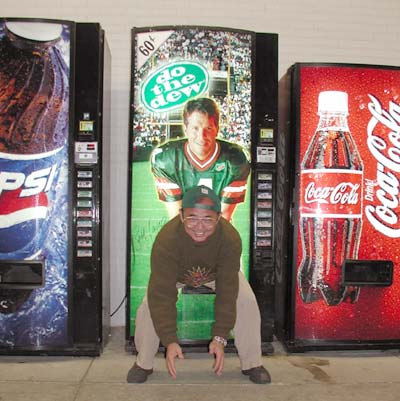 に買出しに行くと、グリーンベイならではの面白い自販機があった(右写真は、思わずファーヴにスナップしたけんちゃん)。ホテルへ戻り、MIA@NYJの後半を見る。他の試合の結果も挿入してくれるのだが、DET@GBは順当な楽勝だったためか、あまり取り上げてもらえない。今週もMIAはオフェンスがスランプだな、と思っているうちに疲れでウトウトしてしまい、試合の最後は見逃してしまった。仕事のため、明朝6時台の飛行機でサンフランシスコに帰ってしまうkobyさんがこちらの部屋にやってきて、今夜のうちに別れの挨拶。