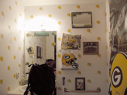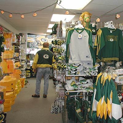 Perfect - Packer Headquarters"というショップだ(外観/店内)。本当にパッカーズグッズなら何でも揃っている。ネット通販もしている。店のおじさんが、「日本から来たのか、トイレもスゴイから見てみろ。ガハハ」と言う(トイレ写真)。全く、トイレまでパッカーズ一色だ。この店にいると、なんでもかんでも欲しくなってしまうので、煩悩を抑えこむのに苦労する。