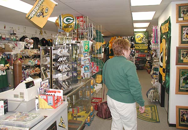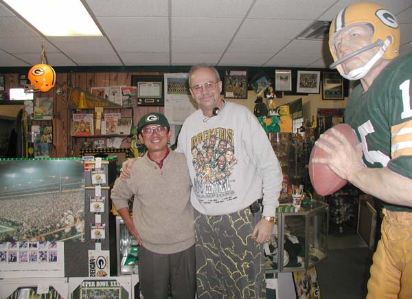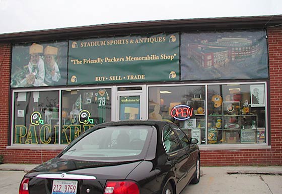 SPORTS & ANTIQUES"というショップへ(外観)。ここは特にユニークな店で、パッカーズ関係の古い新聞、雑誌、イヤーブック、メディアガイドなど、印刷物なら何でも揃っている。量も膨大だ。看板にも"BUY・SELL・TRADE"と書いてあるようにマニア向けだ。自称"活字中毒"のけんちゃんは、ここで動かなくなった。我々の他に客はおらず、長身のオヤジは、はるか日本からの客をとても喜んでくれているようだった。けんちゃんは古い時代の新聞や雑誌をたっぷりと買いこんで、オヤジと写真も撮った。