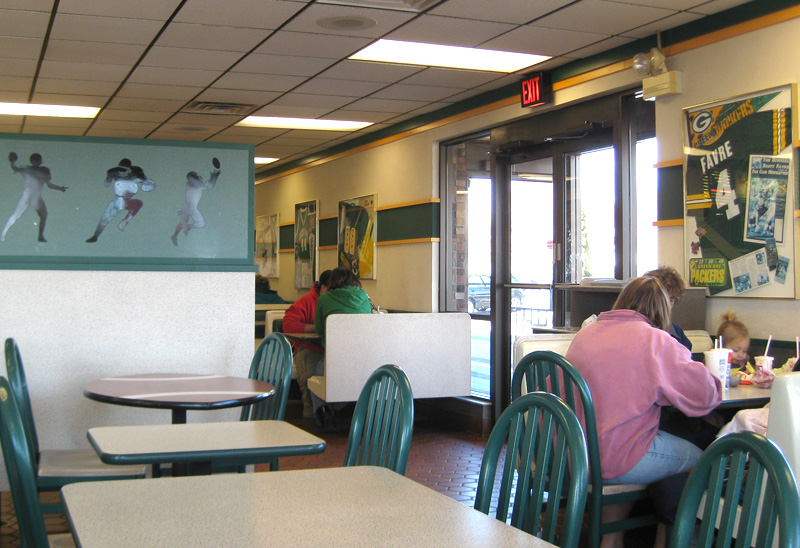 お腹も空いてきたし昼食にする。マクドナルド。わざわざグリーンベイに来てマックはないと思うかもしれない。しかしすーさんが去年から気になられていたここ Oneida St. のマックは全米で唯一グリーン&ゴールドでデザインされているのだ。素晴らしい。他のマックもこんな色合いだった気もしないでもないが、こういうものは信じたもん勝ちだ。さっそく店内へ。おお、なんと店内もしっかりパッカーズ仕様になっているではないか。前日の試合について書いてある新聞に目を通しながらお昼を取る。メニューは普通のマクドナルドだった。