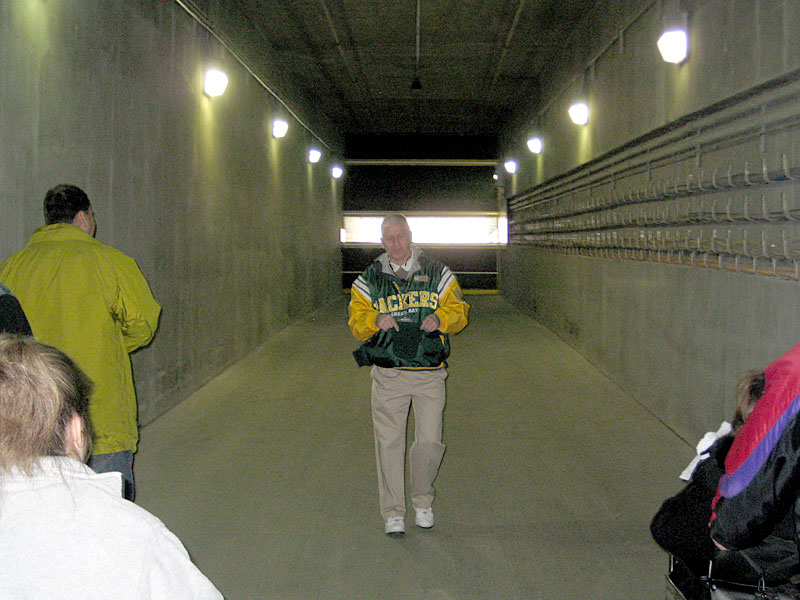 次は選手入場のトンネルを通りフィールドへ向かう。するとここで突然、選手紹介のアナウンスと同時に歓声が響き渡った。なんて粋な計らいだ。鳥肌が立ったじゃないか。そしてフィールドレベルに降り立つ。昨日パッカーズが圧勝したその場所だ。案内人の合図でみんなで一斉に向こうの電光掲示板に向かって「Go Pack Go!」と叫ぶ。響く響く。「こりゃタイムアウト取るわな」と言った声にみんなで頷いた。