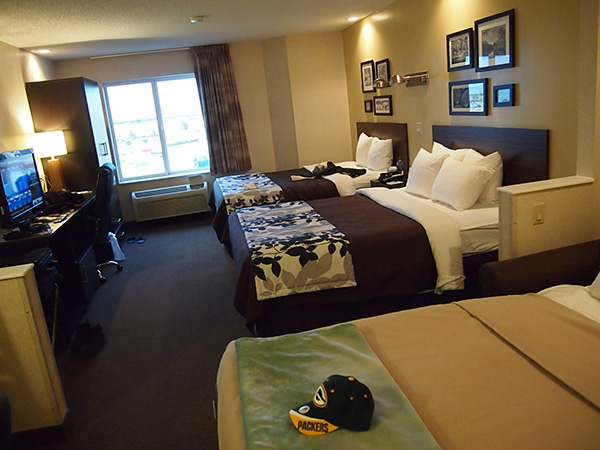 その後、嬉々としてランボー・フィールド周辺の写真を撮りつつホテルへ。カウンターの兄ちゃんは「日本から来た?信じらんねえ」と驚きながらも笑顔で歓迎してくれました。時差ボケ解消を願いつつ、早々と就寝。