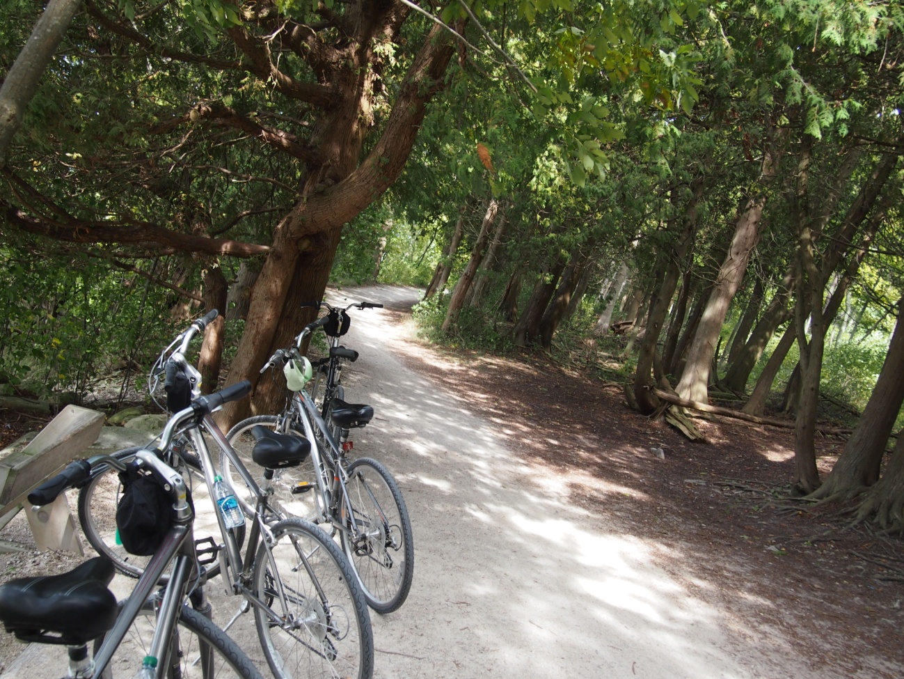 天気は快晴、温度も快適、絶好のサイクリング日和でした。気分よくミシガンの湖岸を走り、いったん休憩、と自転車を止めたあたりで問題発生。サイクリングの割りには結構なスピードで進行していたため、後続のお二人、ぐんさんとTさんの奥様がはぐれてしまうという事態に・・・。(再会後、あれはサイクリングじゃなくサイクルレースだったとの名言を頂きました)