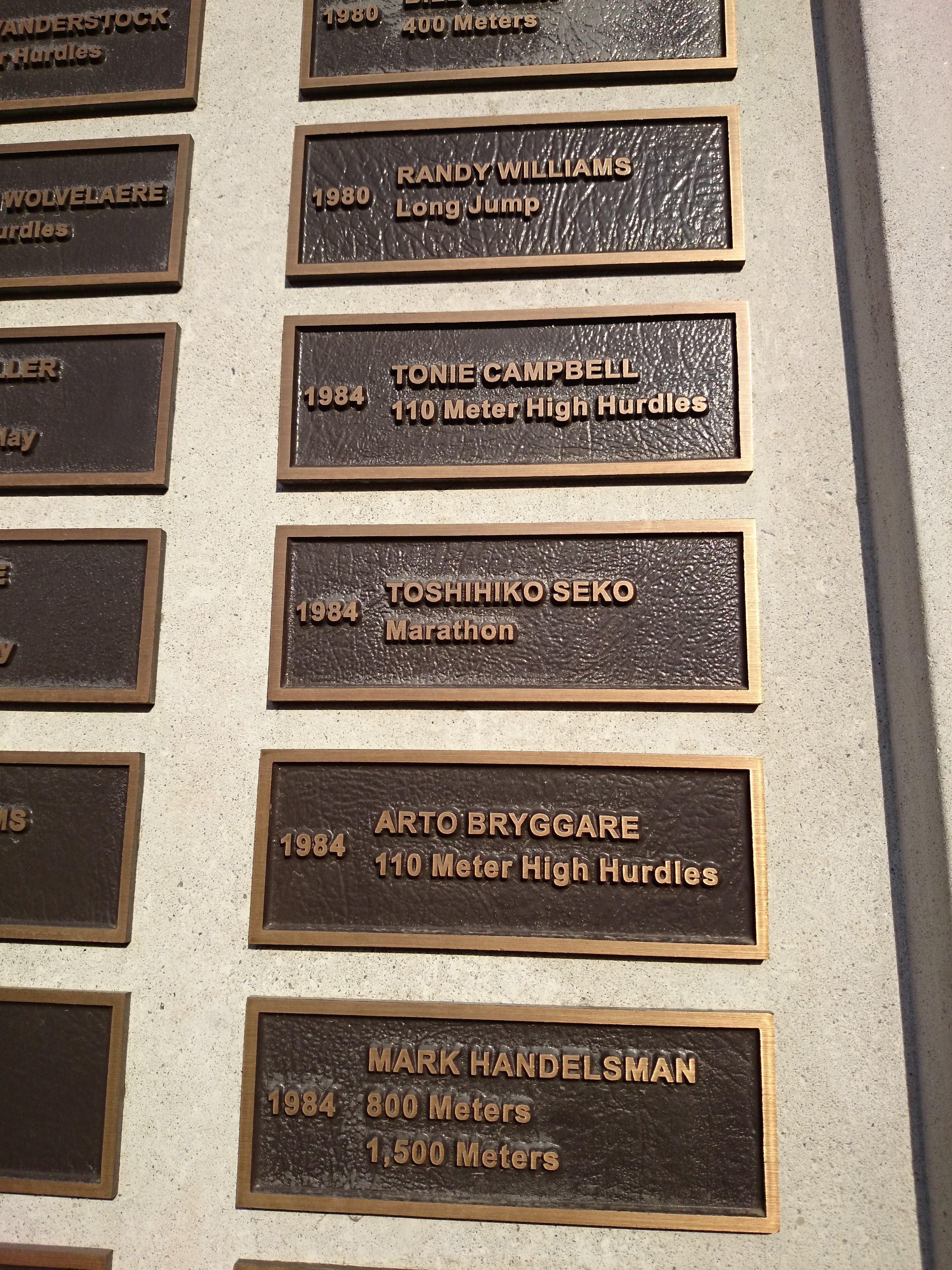 オリンピック出場を果たした選手の記念碑には、一年だけ留学していたマラソンの瀬古利彦選手の名前も。