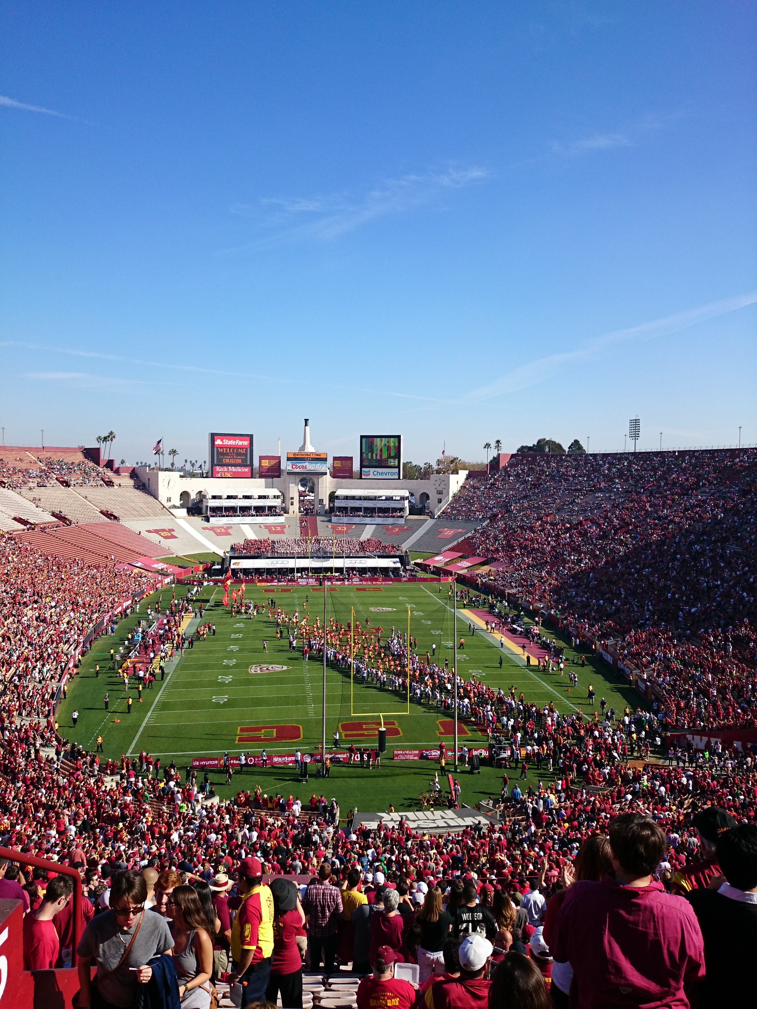 ロサンゼルスにNFLはないけれど、カレッジがある! と言うことで、11月29日(土)にUSC(南カリフォルニア大学)対ノートルダム大学の伝統の一戦を、USCの本拠地ロサンゼルス・メモリアル・コロシアムに観に行った。