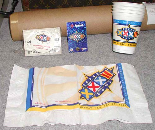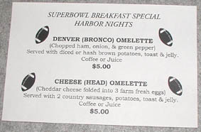 おお、そうです。今日はサンディエゴのスーパーボウルのもうひとつのメッカ、クアラコムスタジアムに行くのです。言うまでもありません。そこで明日はスーパーボウル、今日はエクスペリエンスがあるのです。Mさんはてっきり撮影かと思ったら、どうした風の吹き回しか一緒にエクスペリエンスに行く、と言うではありませんか。で、チケットを届けてくれたボーイ君にはたっぷり?チップをはずんで、ホテルのスーパーボウルブレックファーストなる朝食も食べずに(『あんなもん、やらずぶったくりの便乗商法ですよ』とMさんが言うもんだから、記念にメニュウだけもらった)一路、クアラコムスタジアムを目指しました。
