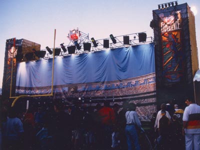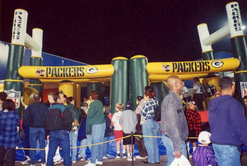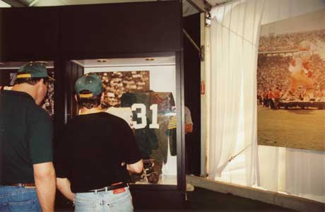 目の前には明日の試合を今や遅し、と待ち構えるクアラコムスタジアム。その前の広場がエクスペリエンス会場です。いたるところにブレット・ファーヴやらレジー・ホワイト、マーク・チュムラ(ああ、89番よ!)がうろちょろしております。車を停めるのもそこそこに、思わず駆け足になる私。