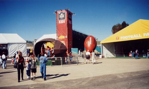 やっと、入り口まで辿り着きました。またまた、一杯並んでいるけれど、ちっとも苦じゃありません。大人しく順番を待ちます。入り口には下がPackers、Broncosの人形になっていて上から首だけ出す遊園地に良くある他愛もないやつがあって、子供達は大喜び。無論、私もやりました。入場料$14なりを払って中に入ると、これがまた愉しい。文字通りの「エクスペリエンス」で50ヤード走ったり、弾丸?パスを投げたり、ブロッキングマシーン、タックリングマシーンに挑戦したり、などなど、自由に参加できるアトラクションがいっぱいです。私もブレットファーヴの顔色を無からしめようかと思ったが、どこにPackersのスカウトの目が光っているかわからない。彼等の目に止まって、もしも日本に帰れなくなったら大変なので思いとどまりました。