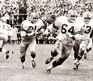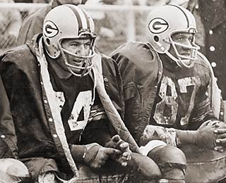 そしてクリーヴランド・ブラウンズを迎えてのNFL決勝。みぞれ混じりの雨が降り続きドロドロにぬかるんだランボーフィールドで、パッカーズ・ディフェンスは、このシーズンに1544ydsを走ってMVPを獲得したRBジム・ブラウンをわずか50ydsに抑え込みます。いっぽうオフェンスはRBホーナングが18回105yds、FBテイラーが27回96ydsを走る完璧な試合運び。前年の覇者ブラウンズを23-12で下し、3年ぶりの優勝を手にしました。