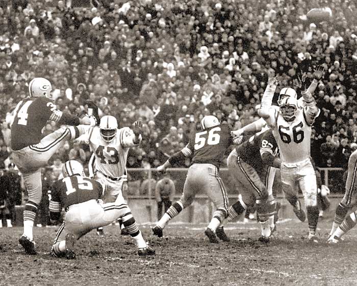 1965年シーズン、パッカーズは10勝3敗1分けで、ドン・シュラHC率いるボルチモア・コルツと同率首位でシーズンを終えました。NFL決勝に進むには、両者によるプレーオフを勝たなければなりません。12月26日、QBジョニー・ユナイタスをヒザのケガで欠くコルツをコルツをランボーフィールドに迎えたパッカーズは、第1QにファンブルリカバーTDを許した際に、タックルに行ったQBバート・スターがケガで退場。10点のリードを許して前半を折り返します。後半は代役のQBブラコウスキー活躍もあって、終了直前に10-10の同点に追いつき、勝負はオーバータイムへ。コルツにも48ydsのFGのチャンスがありましたが失敗に終わり、パッカーズが25ydsのFGを決めて試合終了。