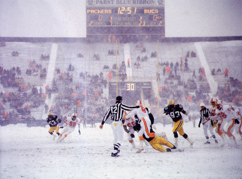 球団史上最悪の悪天候に見舞われたこの日、チケット(もちろん売り切れですが)を持っていながら猛吹雪で試合に来られないファンが多かったため、入場者数はランボーフィールド史上最低のわずか19856人。スタジアムにたどり着けたのはスノーモビルで来たファンが多かったといいます。最大風速18mの吹雪が吹き荒れ、試合中だけで15cm以上の雪が降り積もるなか、パッカーズはパス280yds、ラン232yds、トータルオフェンス512ydsの猛攻。若きQBスティーヴ・ヤング率いるバッカニアーズをトータルわずか65ydsに抑え、21-0で圧勝することができました。(スタッツ)