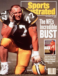 ドラフトのころから薬物の噂は絶えませんでしたが、入団後すぐから期待ハズレであることが明らかになります。検査を恐れてステロイドを使わなくなったうえ、アルコールや鎮痛剤の依存でフットボールどころではなく(2008年の告白記事へ)、2年目に右タックルでスターターになるのがやっと。その後も鎮痛剤依存から立ち直れない彼のプレー内容はパッとせず、わずか3年間でパッカーズを退団となりました。4年間フットボールを離れた間に薬物リハビリを終え、1996年にコルツでNFLに復帰。先発右タックルと右ガードを3年間務め(悪くない内容でした)、キャリアを終えています。