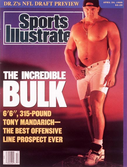 パッカーズドラフト史上最大の失敗といえば1989年1巡2位指名のOTトニー・マンダリッチ。「史上最高の大学OL」と言われ(写真1)、QBトロイ・エイクマンとどちらを1位指名すべきか真剣な議論がなされたほどのスターだったが、パッカーズに指名されてからは鳴かず飛ばず(写真2)。ミシガン州立大での活躍やドラフト前のあの驚異的な体がステロイドによるものだったことは周囲の証言からすでに明らかだったが、本人だけはこれまで否定を続けていた。
